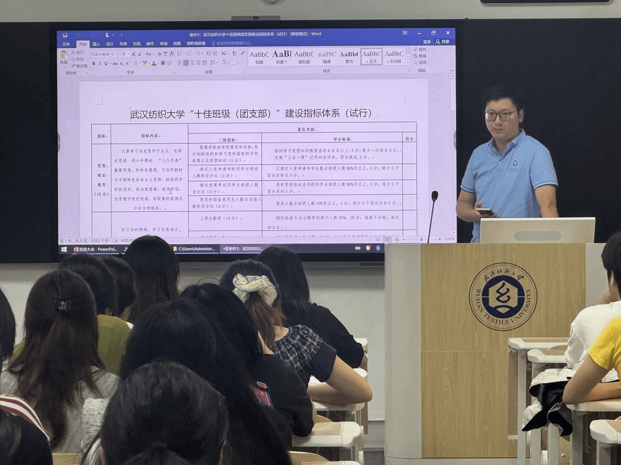 培训中,团委学生会指导老师李宏运围绕“武汉纺织大学‘十佳班级(团支部)’建设指标体系(试行)”展开深入解读,从思想政治教育、学风建设等维度,对指标内容、二级指标及量化考核评分标准进行详细剖析。他强调,班团骨干要以指标体系为引领,在思想引领上凝聚合力,在学风建设上树起标杆,在组织建设上夯实基础。
