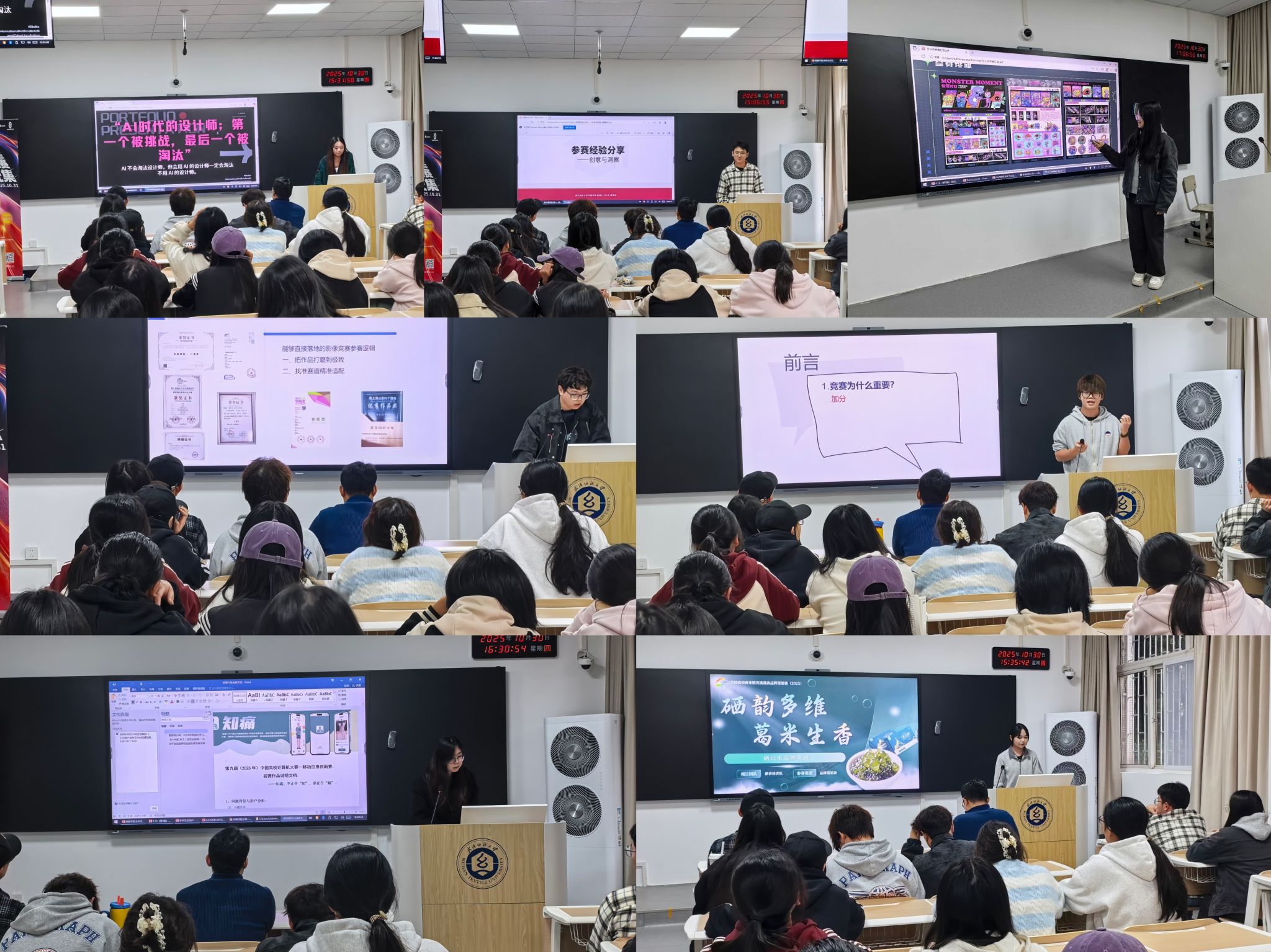 论坛在热烈氛围中拉开帷幕。在中国好创意暨全国数字艺术设计大赛荣获国家级一等奖、数媒11201班许天应同学从参赛的创意来源、如何将灵感转化为作品、参赛的收获和感悟以及对同学们的参赛建议等方面进行分享,干货满满;数媒12201班的唐豫祯则结合自己在米兰设计周、蓝桥杯、NCDA等多个赛事获奖作品进行展示和讲解,重点讲述自己是如何运用人工智能工具助力设计创作提升专业实践能力;数媒12201班的代欣妍向同学们讲解了参赛作品具体创作过程,尤其是人工智能工作流的介绍,同时分享了前往浙江理工大学参与企业限时命题创作和参加D20全球设计院长峰会的经历,鼓励同学们AI时代要勇于拥抱前沿专业技术,做一个“导演型”、“有温度”的设计师;广告学12202班郑易炜同学则以2025年第21届大广赛参赛经历为切入点,向同学们展示自己如何在参赛中充分利用自己的兴趣和特长,精准对接各个赛事的主题与要求,获得众多竞赛奖项的经历;广告学12302班崔黎则讲述了自己在日常学习生活点滴当中如何备战大广赛的故事,在与现场同学轻松活泼的互动中让大家感受到满满的参赛热情;全国高校商业精英挑战赛-品牌策划竞赛国家级二等奖获得者、广电12201班陈丹丹同学向在场师生展示了项目背景、产品介绍、商业分析、策划方案、风险管控、团队介绍和发展规划,揭秘了作品背后的技术攻坚与团队协作,极具专业性和学术性;数媒12301班的毕婧怡同学讲述了她在“中国好创意”、中国高校计算机大赛等赛事中中如何将天马行空的创意落地为获奖作品的动人故事。分享环节精彩纷呈,现场掌声不断。同学们的讲述不仅是对成功经验的总结,更是对勇于探索、不懈奋斗精神的生动诠释。