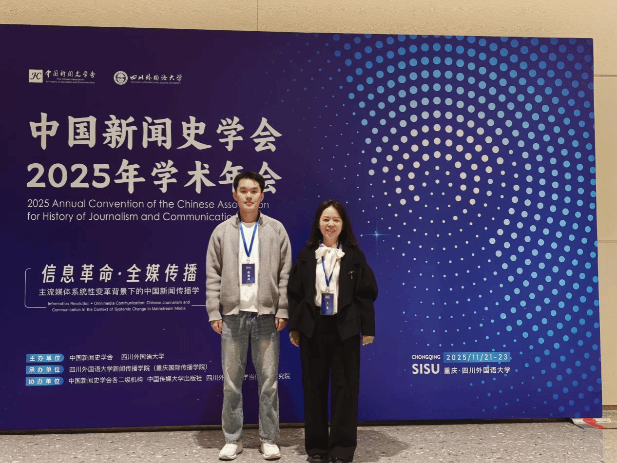 2025 年 11 月 21 日至 23 日,中国新闻史学会2025年学术年会在重庆召开。传媒学院时尚传媒量化研究中心青年博士王慧、2024 级新闻与传播专业硕士研究生陈超峰投稿的论文《为何选择AI而不是人?——基于混合研究方法的负面自我披露意愿研究》被年会正式录用并受邀与会交流发言。