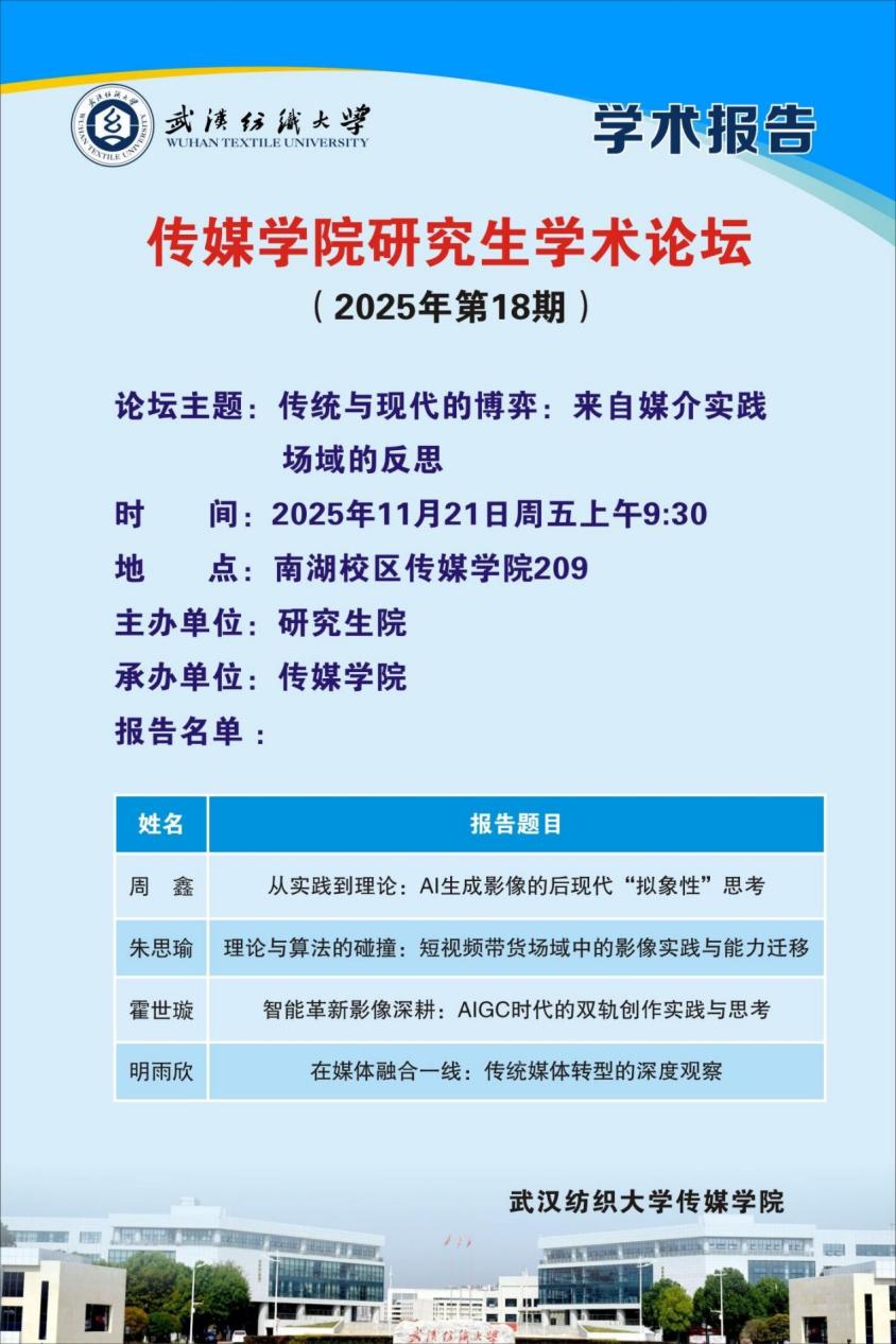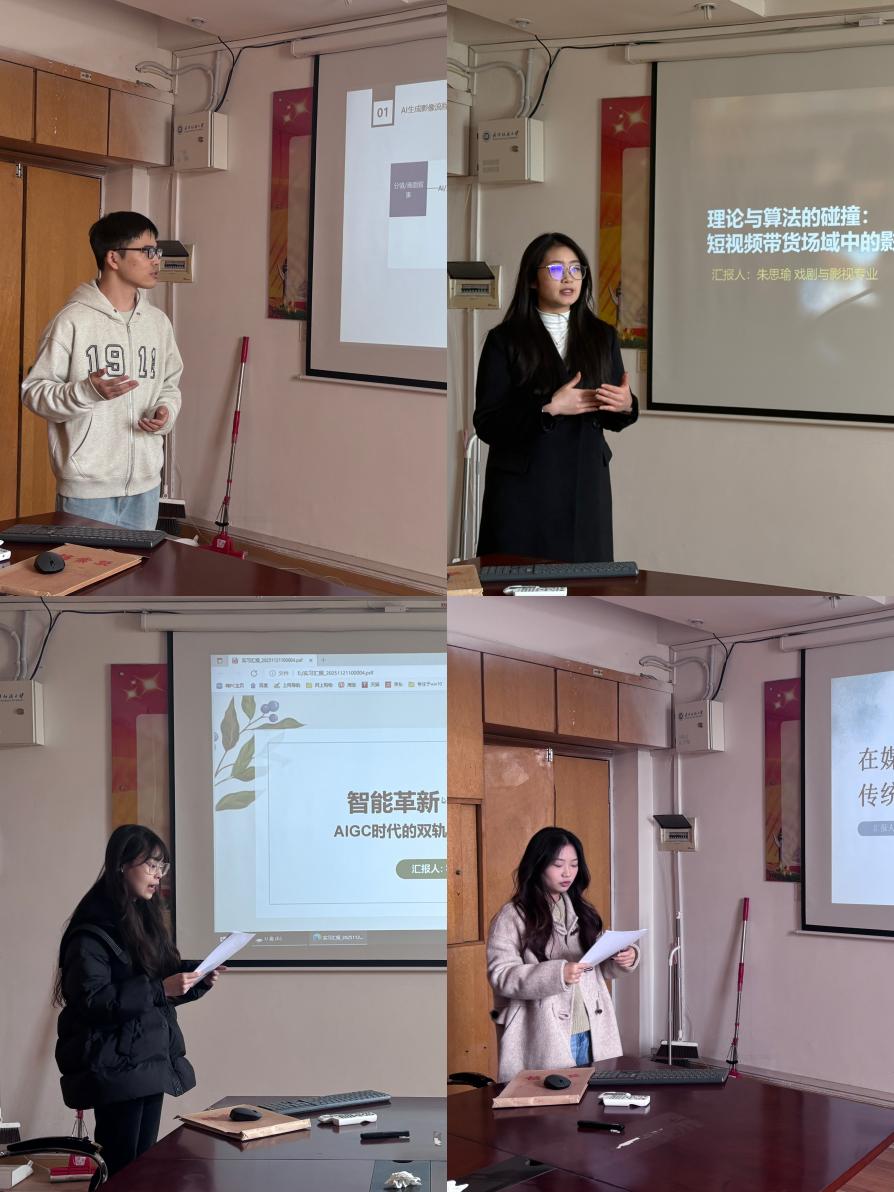 11月21日上午10点,传媒学院2025年第18期研究生学术论坛在308会议室举行。此次论坛以“传统与现代的博弈:来自媒介实践场域的反思”为主题,聚焦于媒介融合背景下的实践观察与理论思辨。报告人为2024级戏剧与影视专业的周鑫、朱思瑜、霍世璇,以及新闻与传播专业的明雨欣等四位同学,他们结合在湖北电视台纪录片部、海豚传媒、荆楚网等媒体的实习经历,分享了各自的实践感悟与理论思考。论坛由副院长马庆主持并点评。