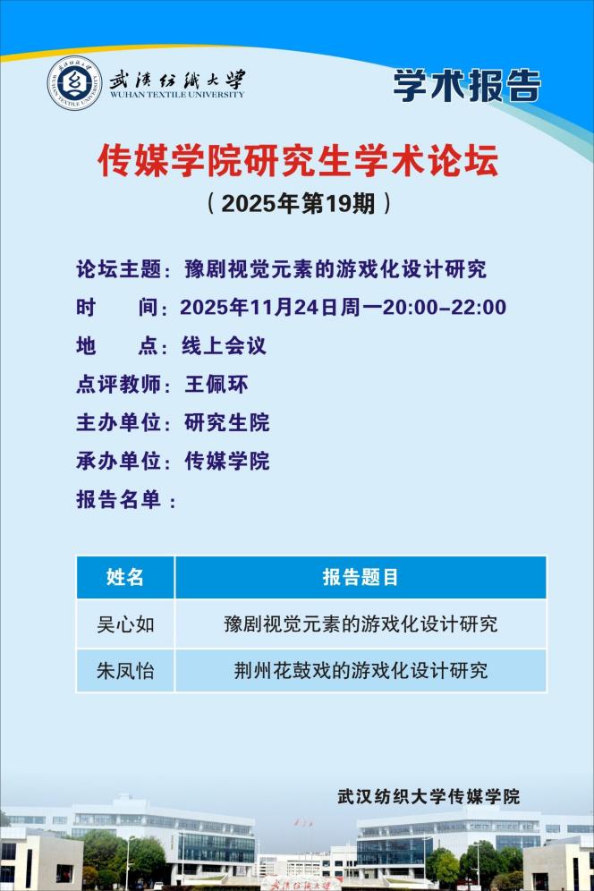 11 月 24 日 晚20时,传媒学院2025年第 19 期研究生学术论坛在线上举办。本次论坛以豫剧视觉元素的游戏设计为主题,2024级设计专业研究生吴心如、朱凤怡依次进行汇报分享,论坛由王佩环老师主持并点评。