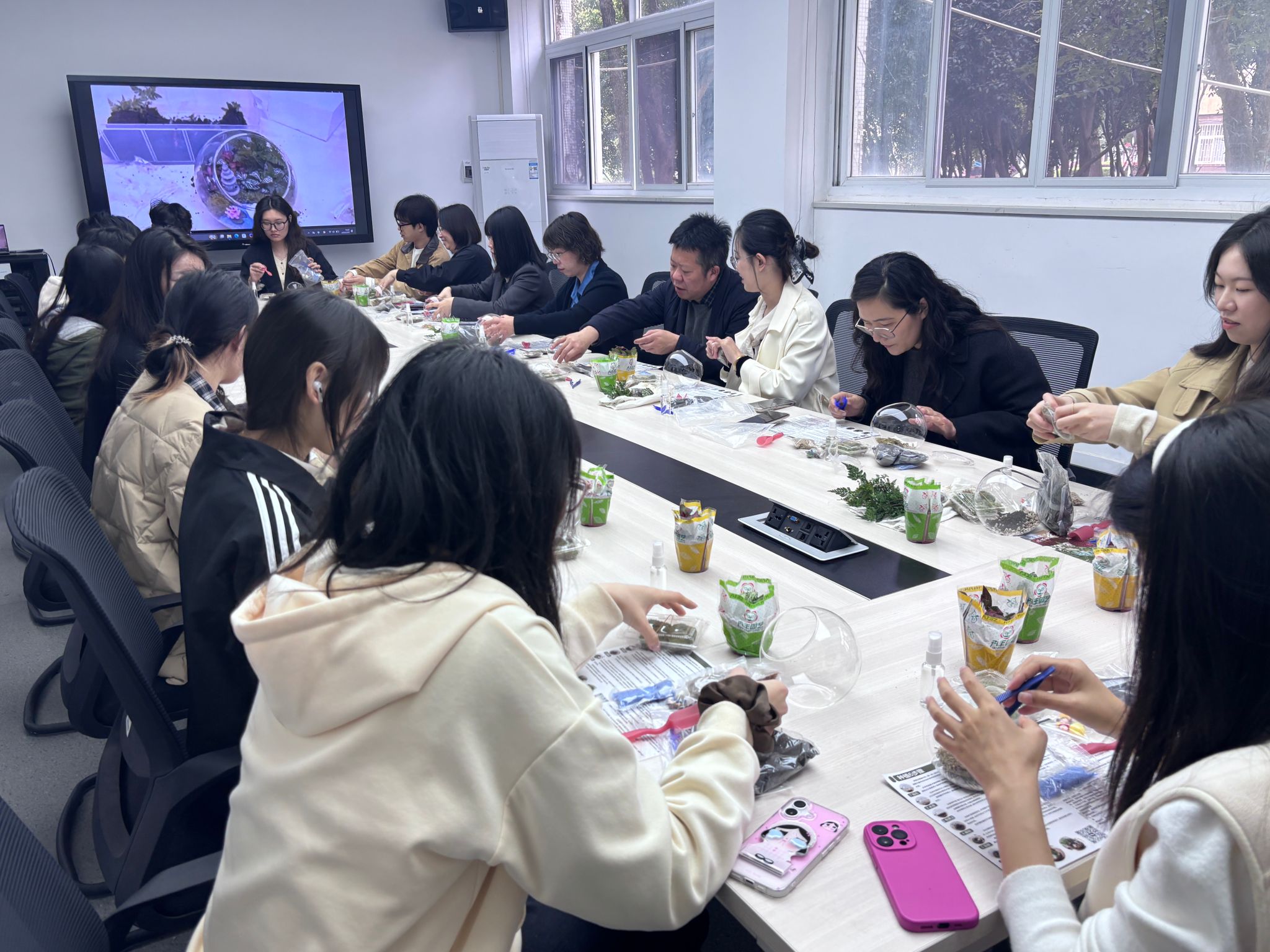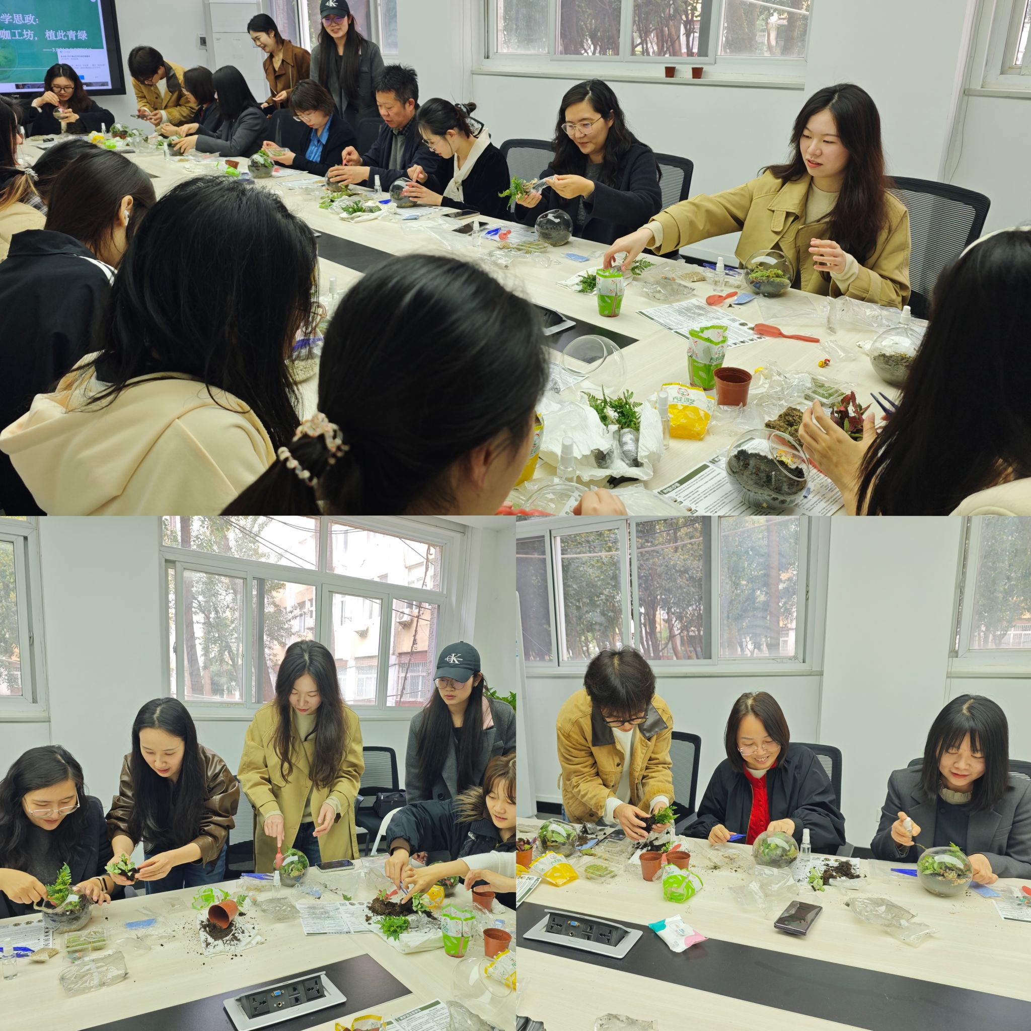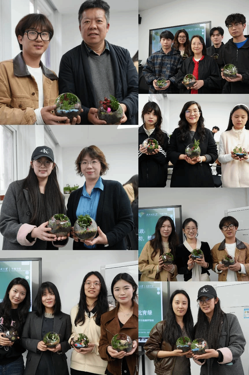 为深化导学思政建设,丰富研究生课余文化生活,搭建师生交流互动平台,3月31日,传媒学院在西配楼S105学术会客厅开展“青咖工坊·植此青绿”微景观盆栽制作活动。学院党委书记秦梦、院长望海军,德育导师程呈,研究生导师代婷婷教授、熊蕾副教授、雷月秋和辅导员王然等与学院研究生共同参与,师生携手将盎然绿意装进方寸瓶间,在沉浸式手作中舒缓压力、拉近距离,将导学思政与心理健康教育融于一场春日里的美育实践。