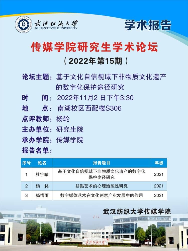 2022年11月2日下午15:30,传媒学院2022年第15期研究生学术论坛在西配楼S306室举办。2021级研究生杜宇晴、2021级研究生杨铭、2022级研究生杨惜雨结合自身近期的学术研究,对自己的论文开题和研究情况进行了汇报,并对非物质文化遗产的数字化保护途径表达了自己的看法。杨轮副教授对作品进行了点评并提出了相关建议。