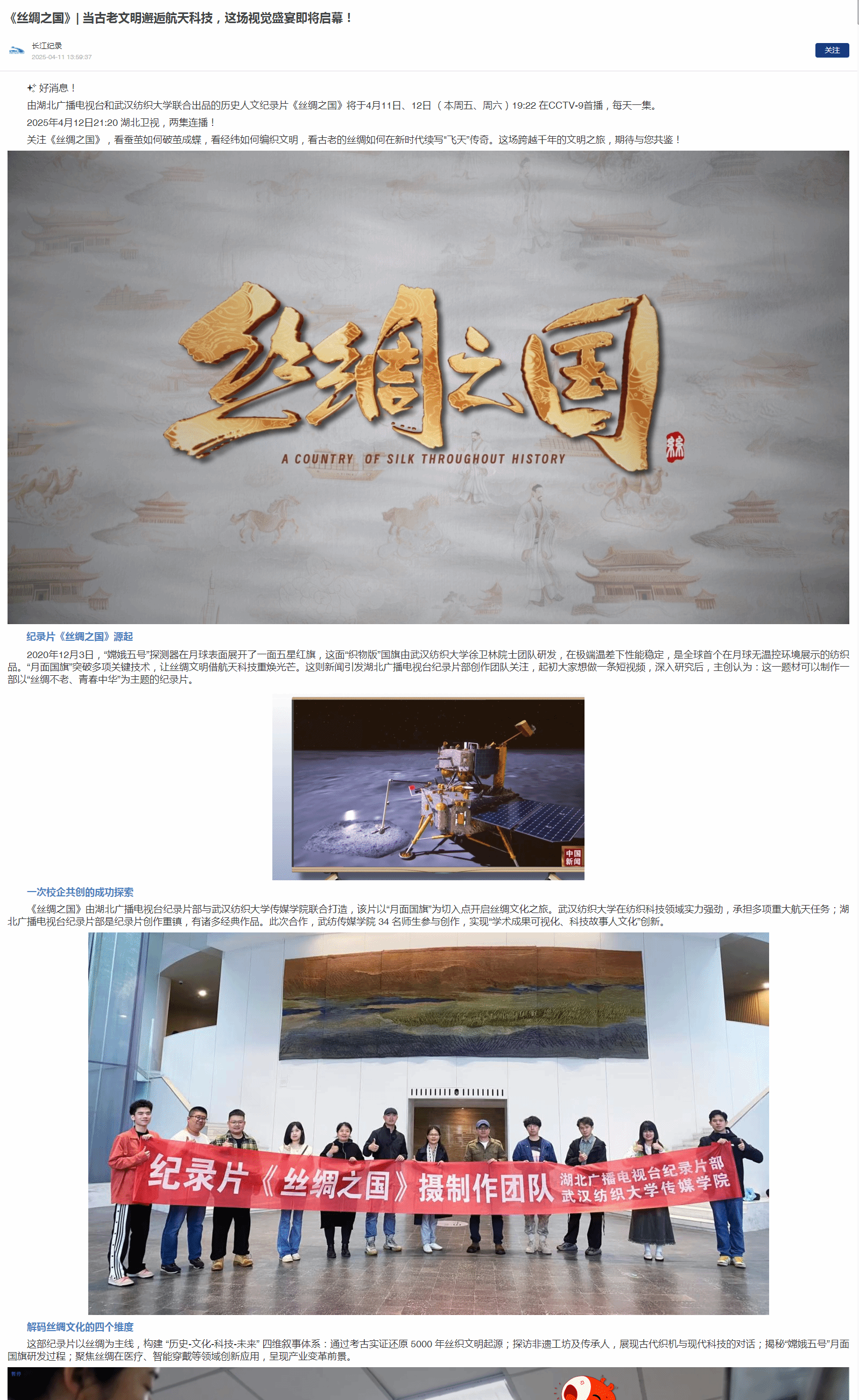 《丝绸之国》由湖北广播电视台纪录片部与武汉纺织大学传媒学院联合打造,该片以“月面国旗”为切入点开启丝绸文化之旅。武汉纺织大学在纺织科技领域实力强劲,承担多项重大航天任务;湖北广播电视台纪录片部是纪录片创作重镇,有诸多经典作品。此次合作,武纺传媒学院 34 名师生参与创作,实现“学术成果可视化、科技故事人文化”创新。